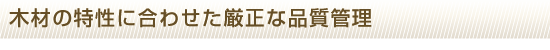 | 木材は伐採後すぐに使用できるものではありません。徐々に水分が抜け、乾燥していく過程で収縮を起こし、様々な形状変化が発生します。また、長期間乾燥をさせないとカビや腐りを引き起こしてしまいます。木材は、しっかりと乾燥させることで品質的にも安定し、加工に適した木材となるのです。私たちは豊富なノウハウと充実した環境で、お客様のもとへできるかぎり良いコンディションの木材をお届けする管理体制を整えています。 | ![]() |